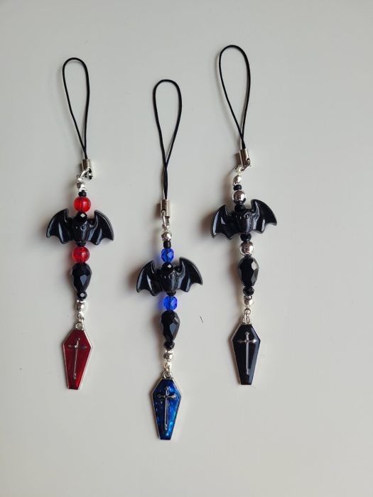 Beaded phone strap with black beads, red beads, silver beads or blue beads, large bat bead and a coffin pendant. The coffin is one-sided with silver on the back.